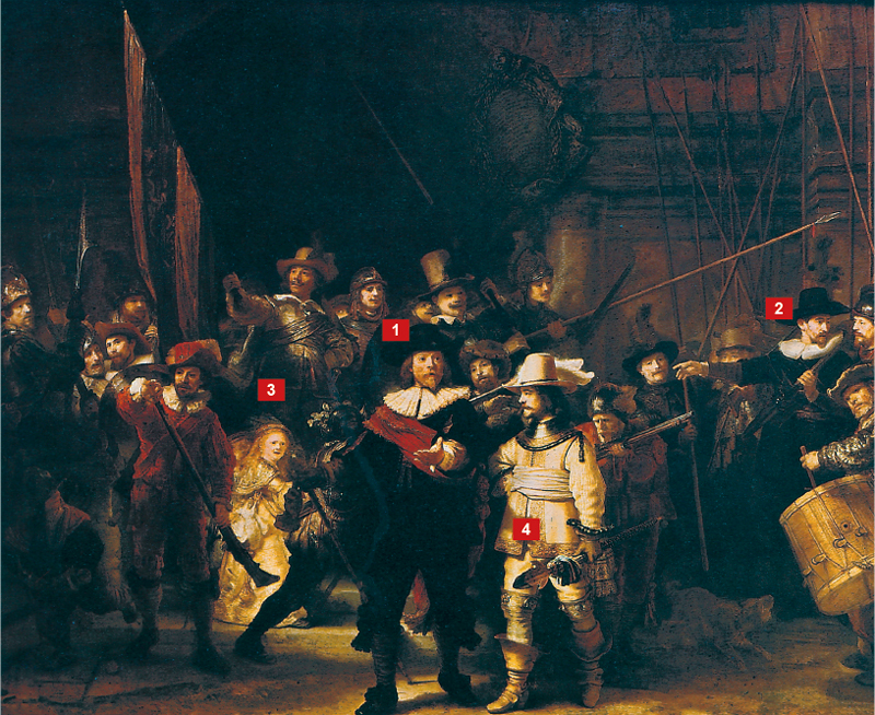- Il dipinto, di grandi dimensioni, comprende 16 personaggi storicamente identificati, tra cui, al centro, il capitano della guardia civile Frans Banning Cocq.