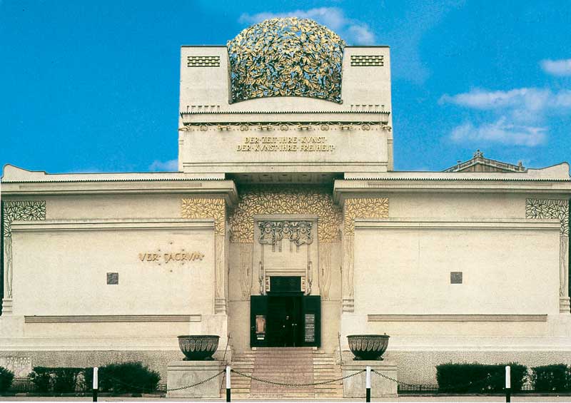 Joseph Maria Olbrich, allievo di Wagner, progettò il Padiglione della Secessione viennese. Le sue razionali geometrie si impreziosiscono con raffinate decorazioni, quali il fregio floreale sotto il cornicione o la cupola in rame dorato, traforata per far filtrare all’interno la luce.
